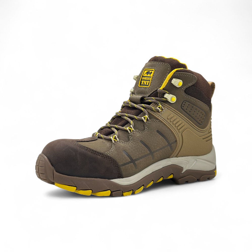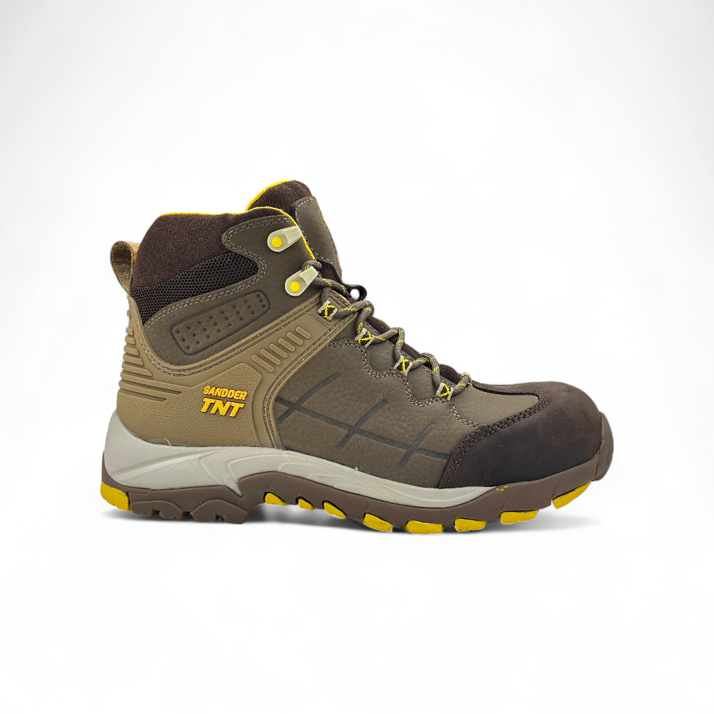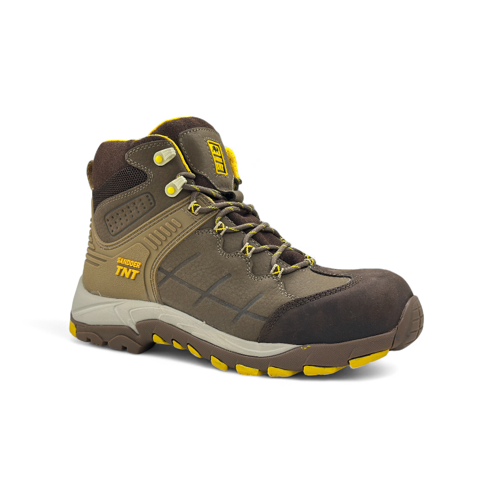 El botín de seguridad dieléctrico Storm de Sandder TNT está especialmente diseñado para entornos industriales donde la seguridad es clave. Este modelo destaca por su puntera de fibra de vidrio, la cual ofrece protección contra impactos de hasta 200J y una excelente resistencia a la compresión de 15 kN, garantizando la seguridad de los pies sin el peso adicional del acero. La suela de caucho nitrilo proporciona un agarre excepcional en superficies resbaladizas y es resistente a la abrasión, aceites, grasas e hidrocarburos, lo que asegura una mayor durabilidad y seguridad en el trabajo.